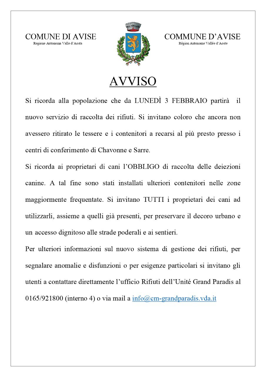 1) l'avviso affisso nelle bacheche in merito alla raccolta delle deiezioni canine e al nuovo servizio di raccolta rifiuti che partirà lunedì 3 febbraio.
