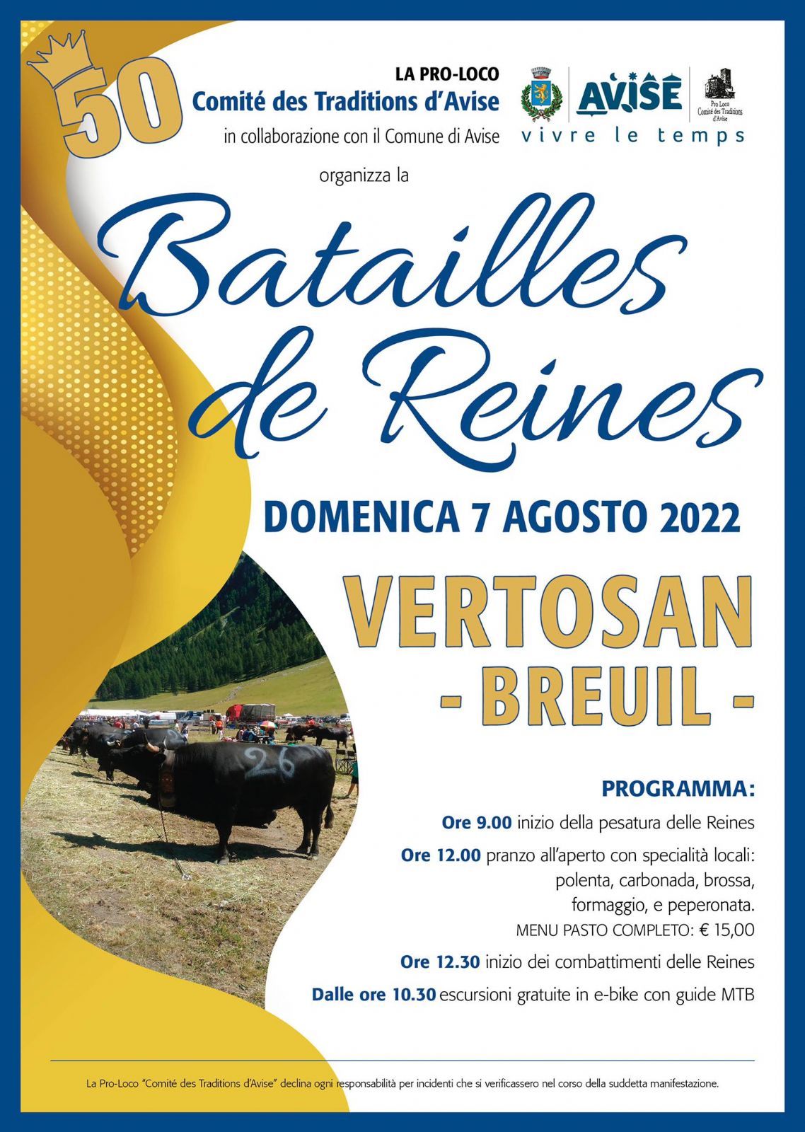 Domenica 7 agosto si terrà nuovamente la batailles de reines nel vallone di Vertosan organizzata dal comité des traditions d'Avise in collaborazione con il comune.
