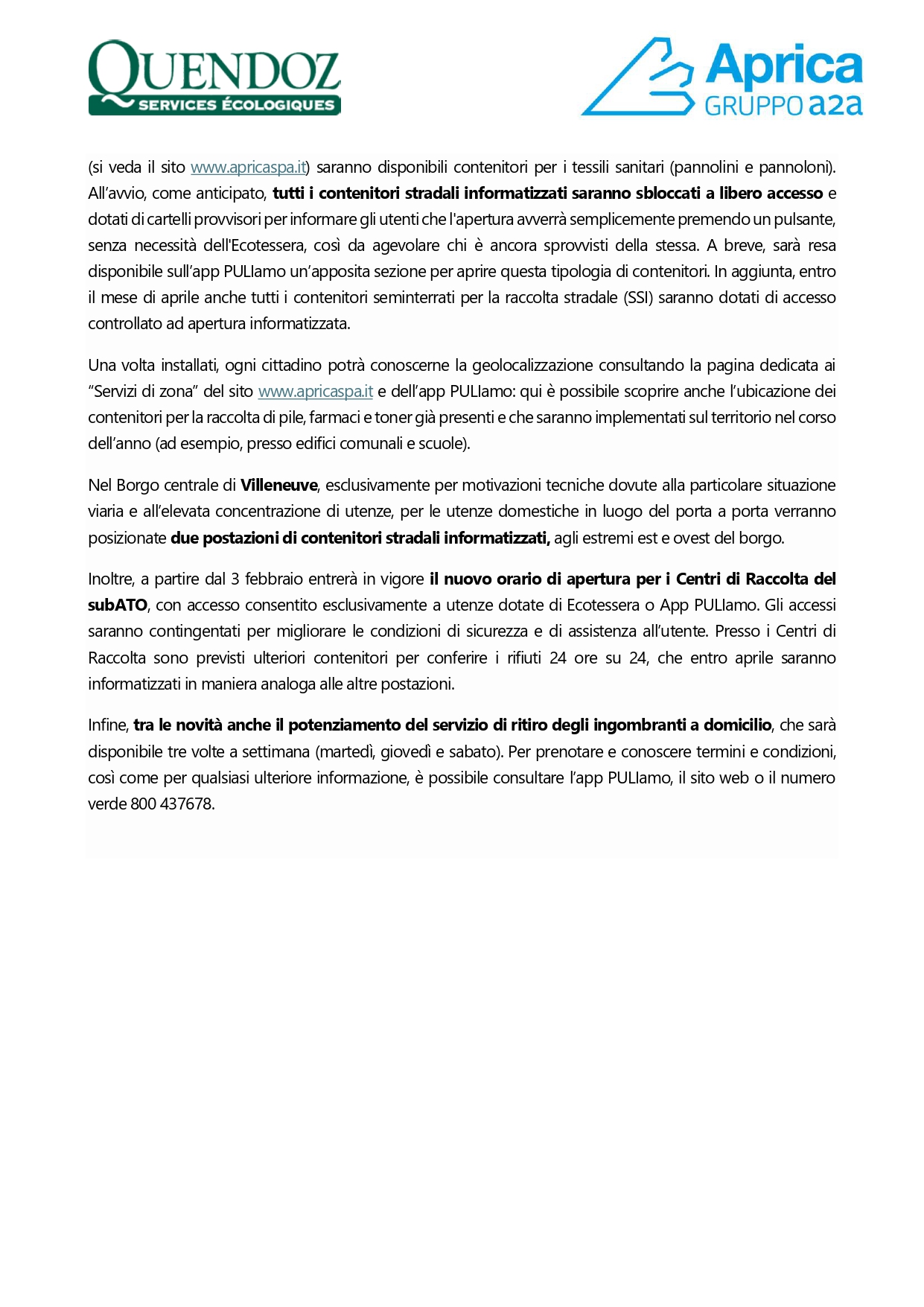 In allegato le ultime comunicazioni in merito all'avvio del nuovo servizio di raccolta rifiuti