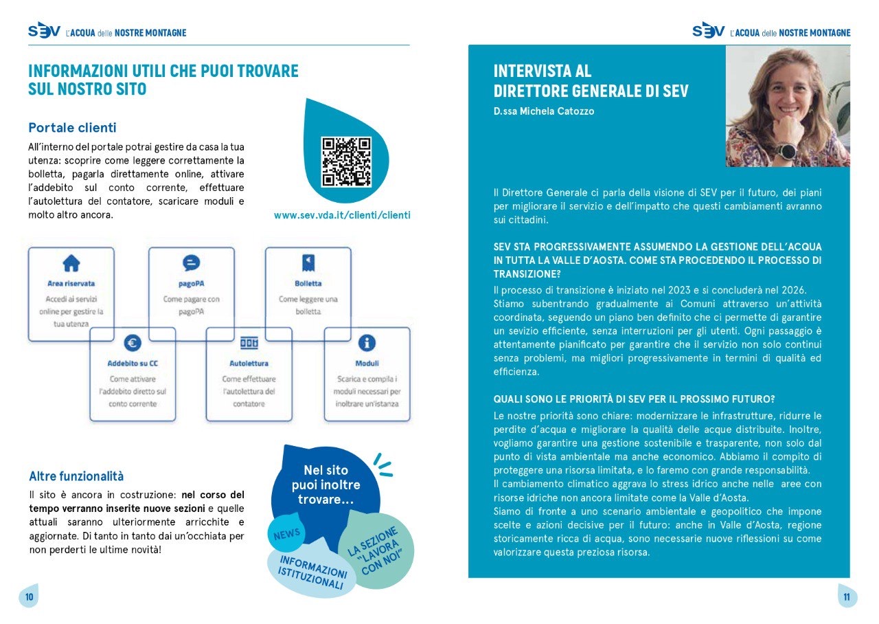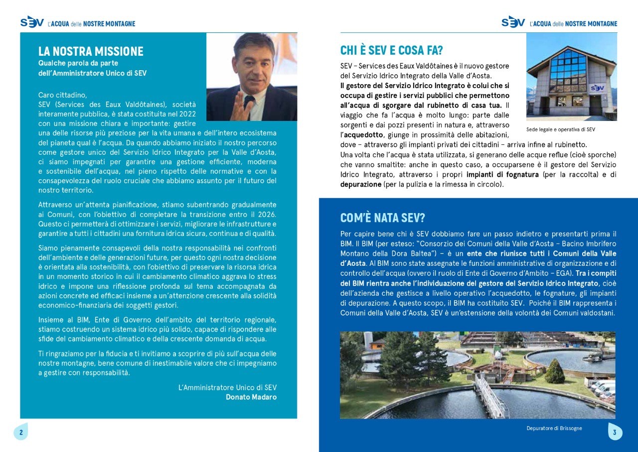SEV è il nuovo gestore del Servizio Idrico Integrato della Valle d’Aosta. Si occupa di: