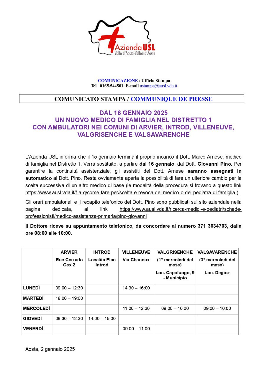 Il 15 gennaio concluderà il proprio incarico il Dott. Marco Arnese. A sostituirlo sarà, a partire dal 16 gennaio, il Dott. Giovanni Pino. A darne comunicazione è l'azienda Usl. In allegato gli orari del Dott.Giovanni Pino