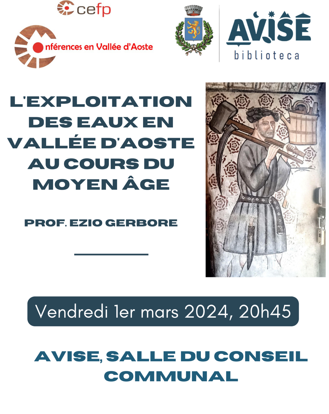 Vendredi 1er mars h 20.45 dans la salle du conseil d'Avise se tiendra la conférence "L'exploitation des eaux en Vallée d'Aoste au cours du Moyen Âge" tenu par le prof.Ezio Gerbore en collaboration avec le Centre d'études francoprovençales