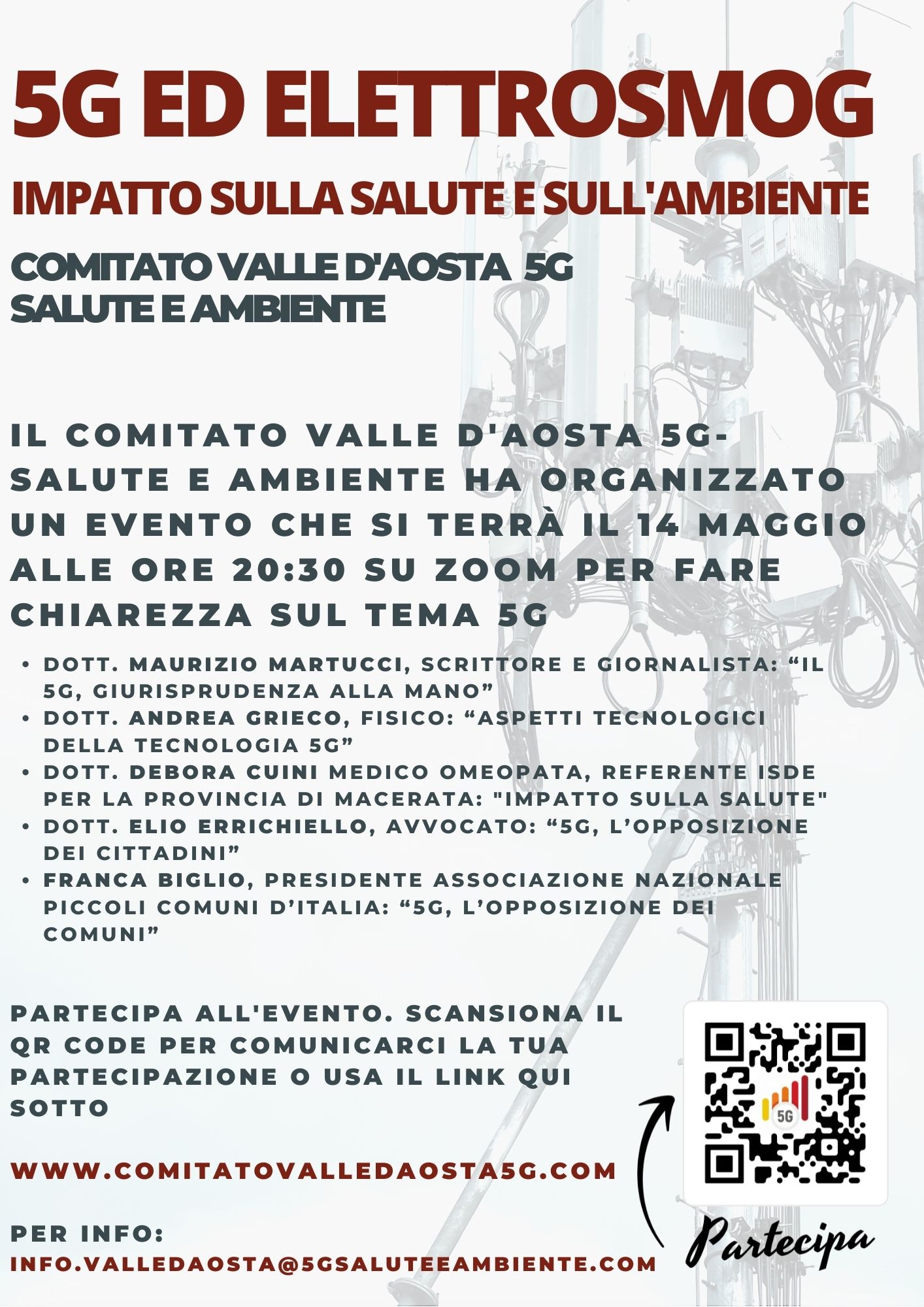 Il comitato Valle d'Aosta 5G Salute e Ambienta organizza un dibattito online sul 5G il 14 maggio 2021.