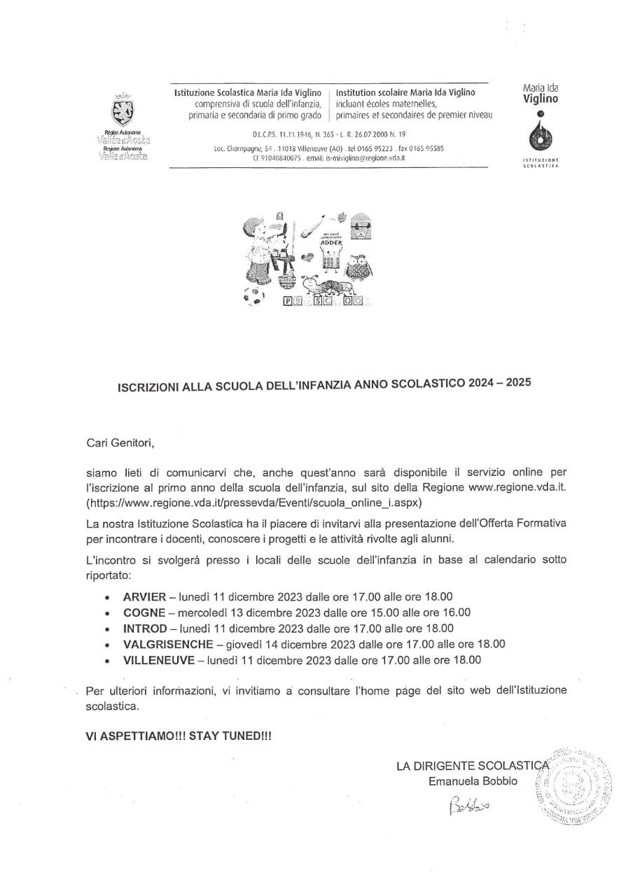 In allegato l'avviso in merito alle iscrizioni alla scuola dell'infanzia per l'a.s.2024/2025 e le date delle Porte Aperte