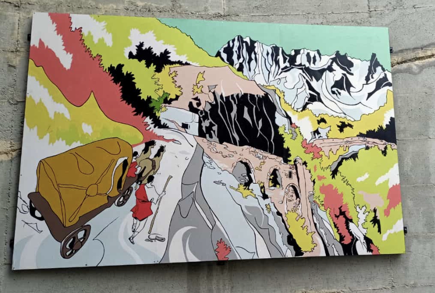 Les 5 peintures murales représentent le territoire et les traditions de la commune d’Avise. Le premier rappelle la position stratégique d’Avise depuis toujours point de passage obligatoire avec Pierre Taillée et la vue sur le Mont Blanc, le second représente les monuments historiques liés à la période médiévale avec les deux châteaux, l’église paroissiale et la Maison de Mosse, le troisième représente les traditions et le territoire et rappelle la fête de la Fiocca, la Castagnata et la Bataille des Reines avec les lacs de Dzioule, la Madonnina noire de pointe Oilletta et la pyramide de pierres du col de la Crosatie. Le quatrième veut représenter l’évolution d’Avise et de son peuple, vêtu des costumes d’Avise, avec au premier plan le vieux pont et en arrière-plan le nouveau. Le cinquième contient un peu tous les éléments des autres 4, entourant le logo de "Avise vivre le temps" réalisé par Elisa Avantey.