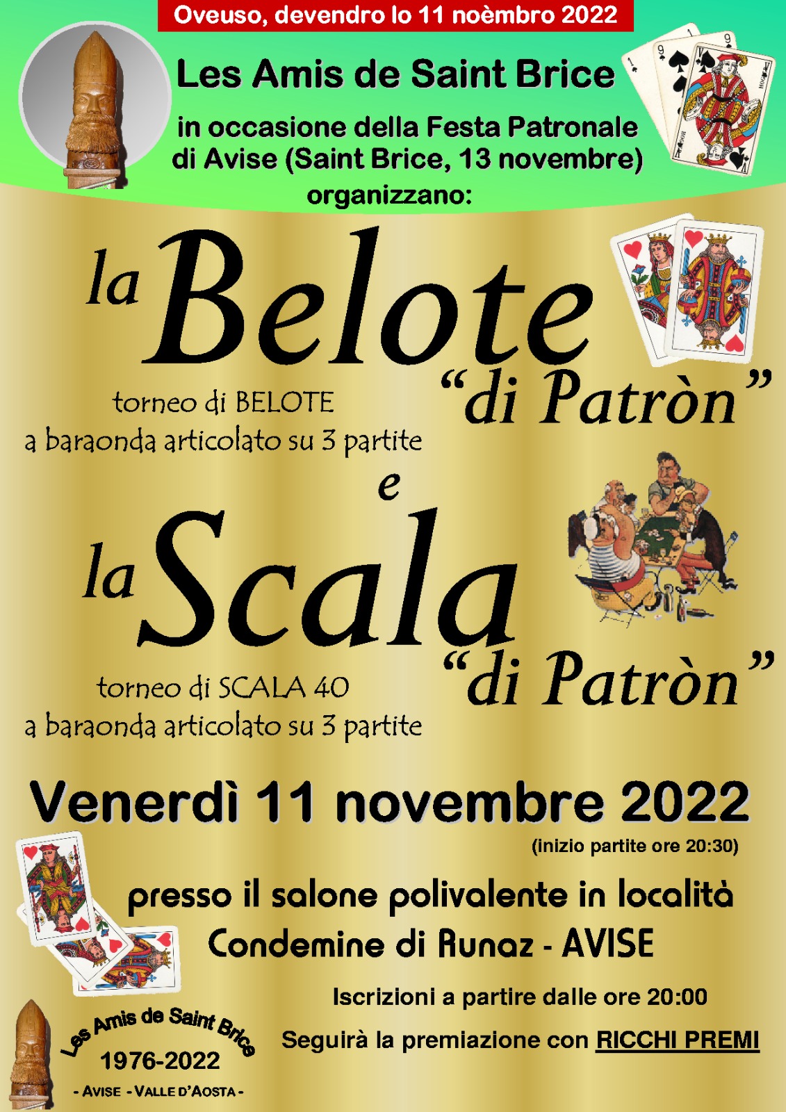 Venerdì 11 novembre presso il salone polivalente di Runaz dalle h 20, Torneo di Belote e Scala 40